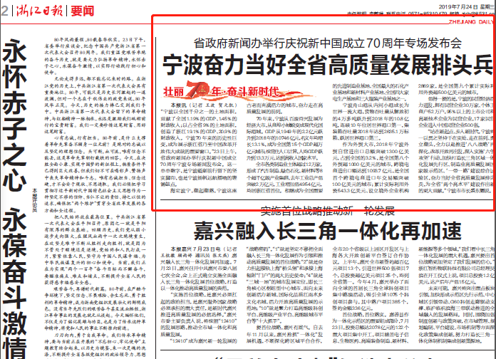浙江在线-宁波频道7月24日讯(浙江在线记者 王波 贺元凯)“宁波以全国千分之一的土地面积,贡献了全国1.19%的GDP、1.45%的财政收入;以占全省9%的土地面积,创造了浙江19.1%的GDP、20.9%的财政收入。宁波70年来的历史性巨变,成为展示浙江省乃至中国改革开放伟大成就的重要窗口。”23日上午,省政府新闻办举行庆祝新中国成立70周年宁波专场新闻发布会。这一串串数字,是宁波砥砺前行留下的坚实脚印,也是宁波扬帆远航擂响的铿锵鼓点。