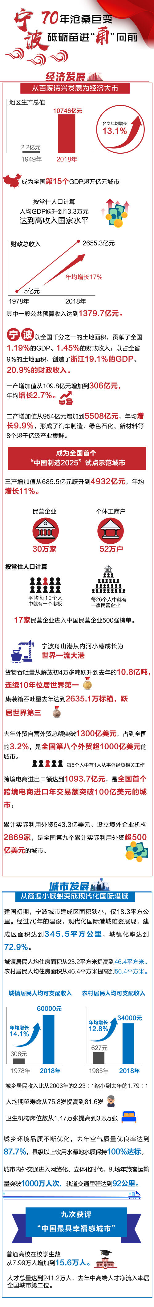 70年来,宁波从百废待兴发展为经济大市,从商埠小城蜕变成现代化国际港城。GDP从1949年的2.2亿元跃升到2018年的10746亿元,名义年均增长13.1%,成为全国第15个GDP超万亿元城市;按常住人口计算,人均GDP跃升到13.3万元,达到高收入国家水平。