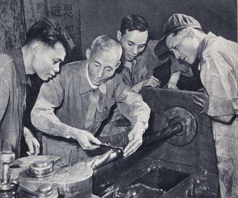 上海永鑫无缝钢管厂潘阿耀(左二)和工人一起炼制一种有条型无缝钢管。