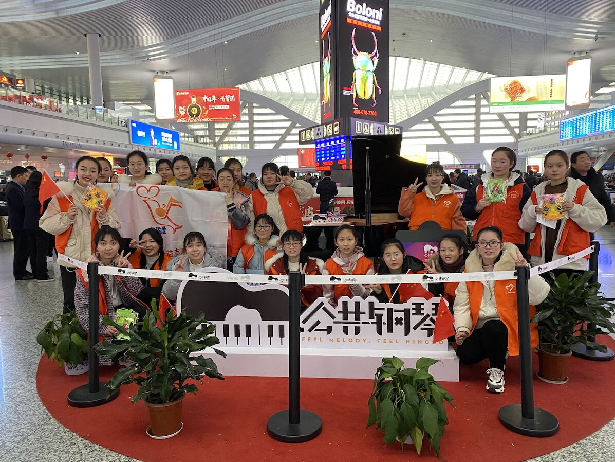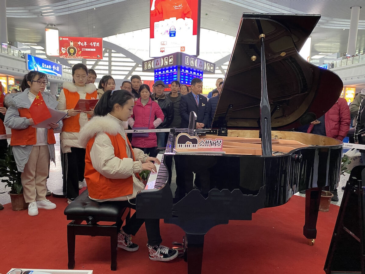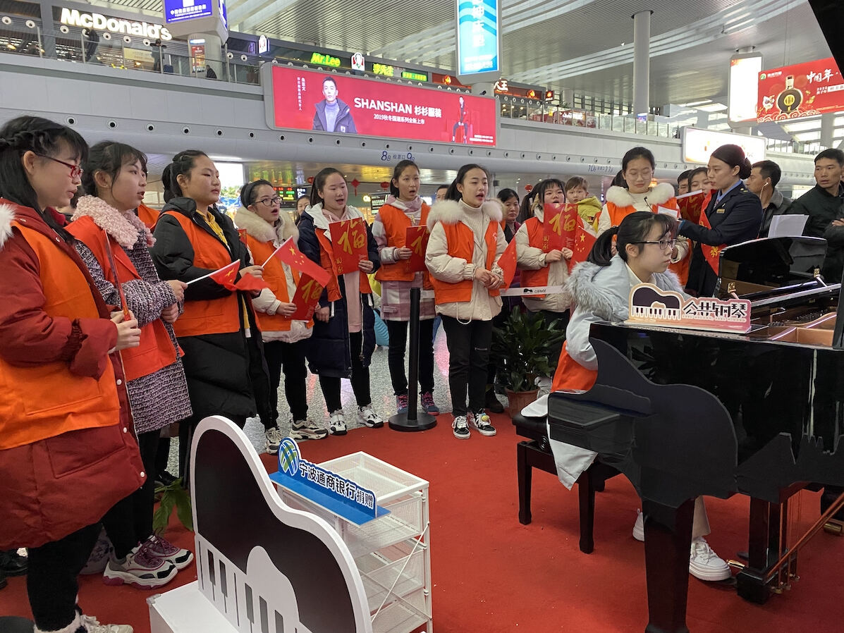 浙江在线-宁波频道1月16日讯(浙江在线记者 竺佳 通讯员 陈哲)1月15日,春运第六天,下午1时,宁波火车站里南来北往的人们匆匆忙忙,又到了回家过年的日子,当“老人不图儿女为家做多大贡献,一辈子不容易就图个团团圆圆……”悠扬的歌声在宁波市火车站候车大厅响起的时候,人们不禁驻足倾听。原来,这是宁波火车站莫奶奶爱心公共钢琴点开展了一场“迷你音乐会”,来自宁波市古林职业高级中学的学生志愿者们,用他们精心准备的一首首乐曲,来表达对大家的新年祝福,这次演出的曲目包括了《新年好》、《春节序曲》、《喜洋洋》、《半个月亮爬上来》等家喻户晓的中国名曲,同学们还倾情演绎了歌曲《常回家看看》,将演出的气氛推向了高潮。