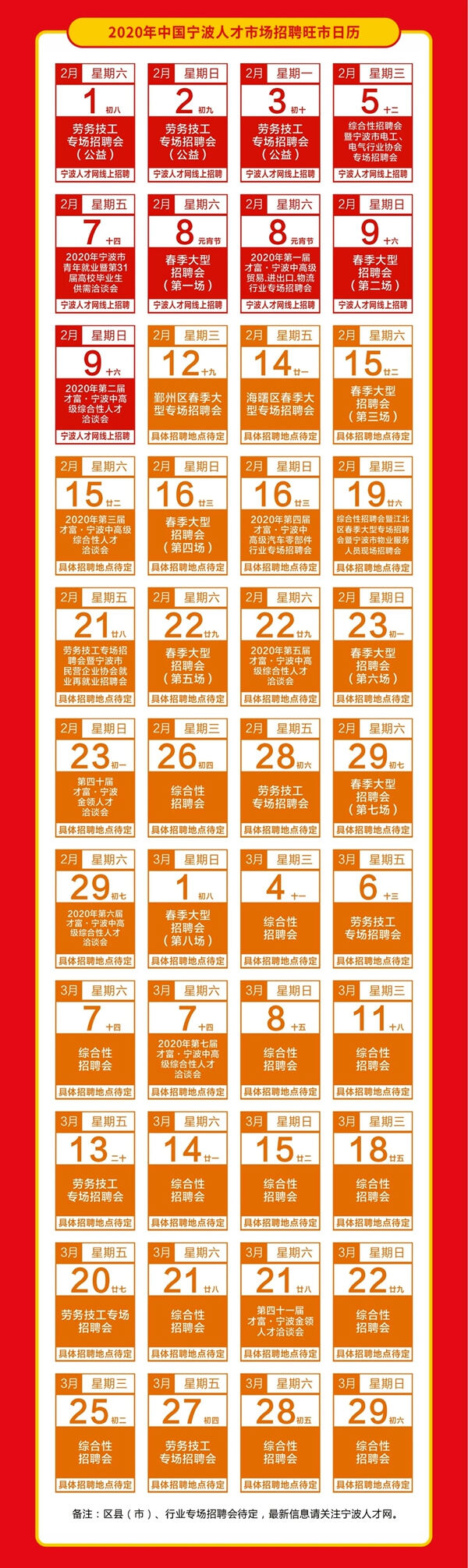 据介绍,节后中国宁波人才市场共安排了40余场招聘活动,持续到3月底,包括“毕洽会”、综合性招聘会、劳务技工专场招聘会、春季大型招聘会、中高级人才招聘会等,其中,2月1日至2月9日,共安排了9 场。