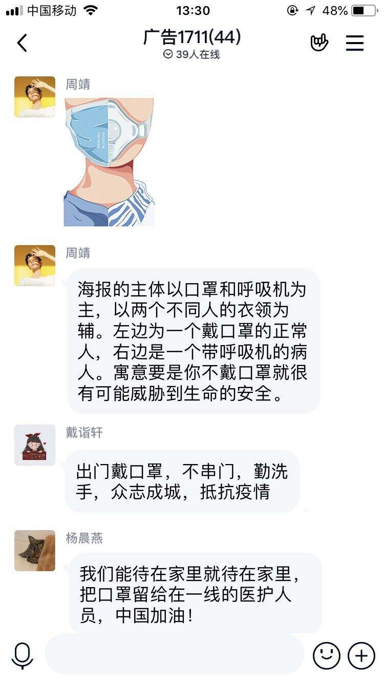 各个二级学院也纷纷积极响应,创新主题班会的方式和内容。建筑与艺术学院的同学们在主题班会上晒出了自己设计的抗击疫情主题作品,分享创作构思和心得。广告1711 周靖在群里介绍,她想要通过一人双面的方式表现“不戴口罩就很有可能威胁到生命安全”的寓意,这种直观形象、富有创意的表现手法很快引发大家的共鸣和踊跃留言。