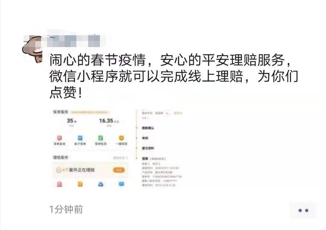 今天接到一笔客户在E企宝小程序提交的报案,疫情特殊时期,考虑到资料邮寄很不方便,我们为客户开通绿色理赔通道,减免单证,简化理赔流程,指引客户在小程序上完成资料上传,30分钟内就完成了结案,并把赔款支付给客户,客户对我们在特殊时期的理赔速度和服务态度表示肯定,并发朋友圈手动点赞。