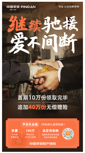守护平安中国,驰援小微企业。为深入贯彻落实党中央、国务院和中国银保监会关于做好新型冠状病毒感染的肺炎疫情防控工作要求,持续强化金融支持和服务保障,2月7日,平安产险宣布为全国10万家小微企业无偿提供专属风险保障,每家企业保额100万元,2月12日,继首期10万份小微企业赠险后,平安产险再追加40万份赠险,累计总保额高达1000亿元,帮助小微企业铸牢坚实后盾,渡过疫情难关。