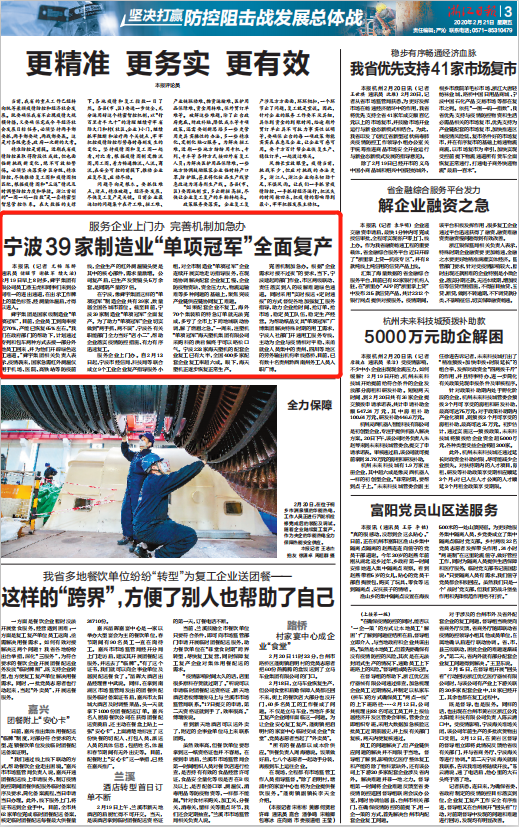 服务企业上门办。自2月13日起,宁波市经信局、科技局等联合成立9个工业企业复产指导服务小组,对全市制造业“单项冠军”企业连续开展实地走访指导服务,在现场协调解决配套企业复工慢、企业防疫物资缺、资金压力大、物流运输难等多种问题的基础上,聚焦突破产业链供应链协同复工难题。