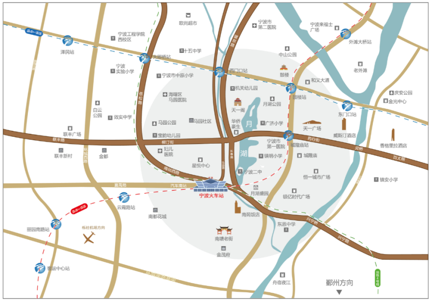 目前,宁波火车站已汇集了城际铁路、客运大巴、地铁、城市公交、机场大等各种交通方式,形成了一个大型综合交通网。2030年,宁波火车站将衔接萧甬线、杭甬客专、甬台温线、金甬线、嘉甬高铁、甬舟铁路等六条线路,交通枢纽优势和人流优势更加明显。目前,宁波火车站日均客流量达12万人次,未来的客流量将日益增加。“南站里”位于宁波城市核心圈——火车南站商圈,与周边的天一商圈、月湖商圈、南塘商圈紧密相连,多个出入口串联着地面人口密集生活区。地铁2、4号均经过宁波火车站,且进出口都在商业街的门口,是通往妇儿医院、马园路方向的必经通道,加上高铁、公交等交通工具,以及包括宁波妇儿医院、酒店、小区、写字楼在内的地面2公里内的高密度生活圈,都为“南站里”带来了庞大又稳定的客流。