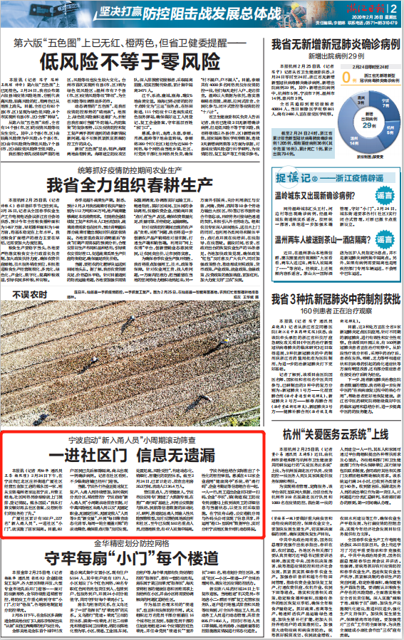 当前,宁波各行各业正提速复工复产,入甬人员持续增加,如何做到分类分区、精准管控?宁波启动“新入甬人员”小周期滚动排查机制,对中高风险地区来甬人员以及“无固定职业、无固定住所、无固定收入”人员等9类“新变量”,开展“每日筛查动态化清零、每周一轮全覆盖对账”的滚动筛查,确保重点对象“及时发现、处置见底、风险受控”,构建动态化、精细化、智能化的防控体系。截至2月24日,已累计走访、排查出租房20.3万间、流动人口36.4万人。