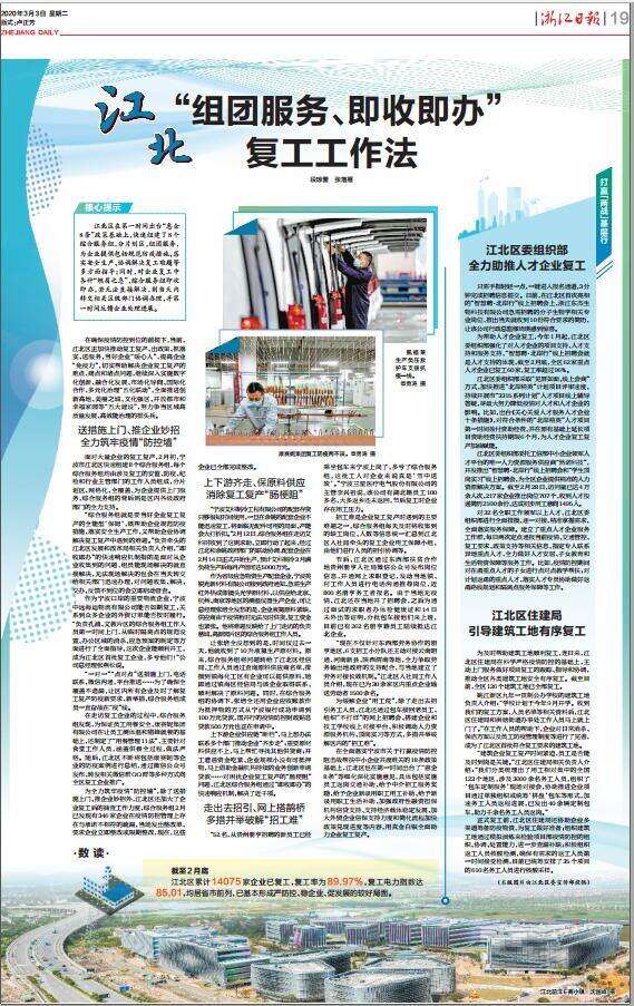 在确保疫情防控到位的前提下,当前,江北区正加快推动复工复产,出政策、抓落实、送服务,当好企业“暖心人”,提高企业“免疫力”,切实帮助解决企业复工复产的难点、痛点和堵点问题,继续深入实施数字化创新、融合化发展、市场化导向、国际化合作、多元化治理“五化联动”,全面推进创新高地、美丽之城、文化强区、开放都市和幸福家园等“五大建设”,努力争当区域高质量发展、高效能治理的排头兵。