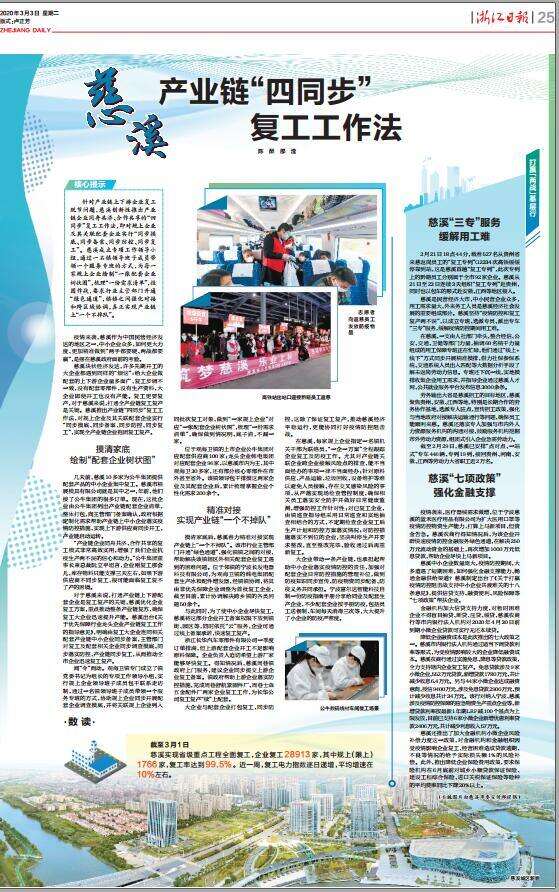 慈溪块状经济发达,许多先期开工的大企业都遇到同样的“烦恼”:给大企业做配套的上下游企业量多面广,复工步调不一致,没有配套零部件,没有生产资料,大企业即使开工也没有产能。复工更要复产,对于慈溪来说,打通全产业链复工复产是关键。慈溪推出产业链“四同步”复工工作法,对规上企业及其关联配套企业实行“同步摸底、同步备案、同步防控、同步复工”,实现全产业链企业抱团复工复产。