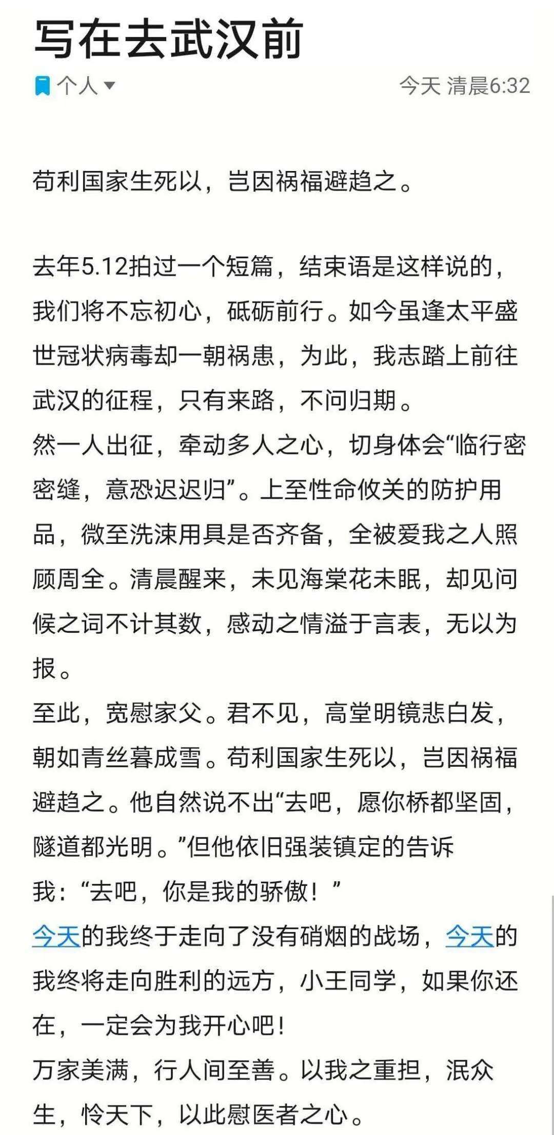 2月9日清晨,是李丰秀“出征”武汉的日子,她剪去心爱的长发,负重前行,在朋友圈写下了自己的出征感言:“亦于心之所善兮,虽九死其犹未悔”,她还特意在记事本里写了下了自己的内心独白《写在去武汉前》。
