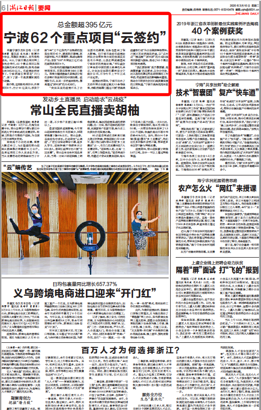 浙江在线-宁波频道3月10日讯(浙江在线记者 段琼蕾 通讯员 宋忆涵)签署合作协议、视频交换展示、宣布签约成功。9日,宁波市重点项目网上签约会举行,62个重点项目以视频连线的形式完成签约,签约金额达到395.33亿元。在疫情防控形势下,宁波招商引资喜迎“开门红”,按下了新一年高质量发展的启动键。