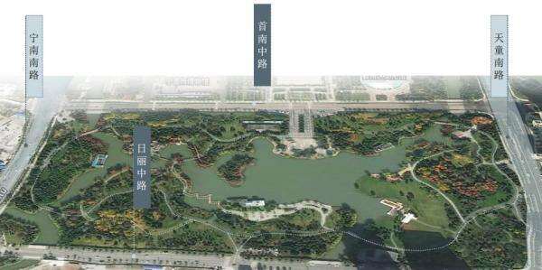 以鄞州公园一期、宁波市博物馆、鄞州文化广场、鄞州文体中心组成区政府职能区核心,打造“一中心”,以宁南路、四明路为坐标轴线完成“两干道”建设。鄞州公园八景改造是“一中心”建设的核心组成部分。