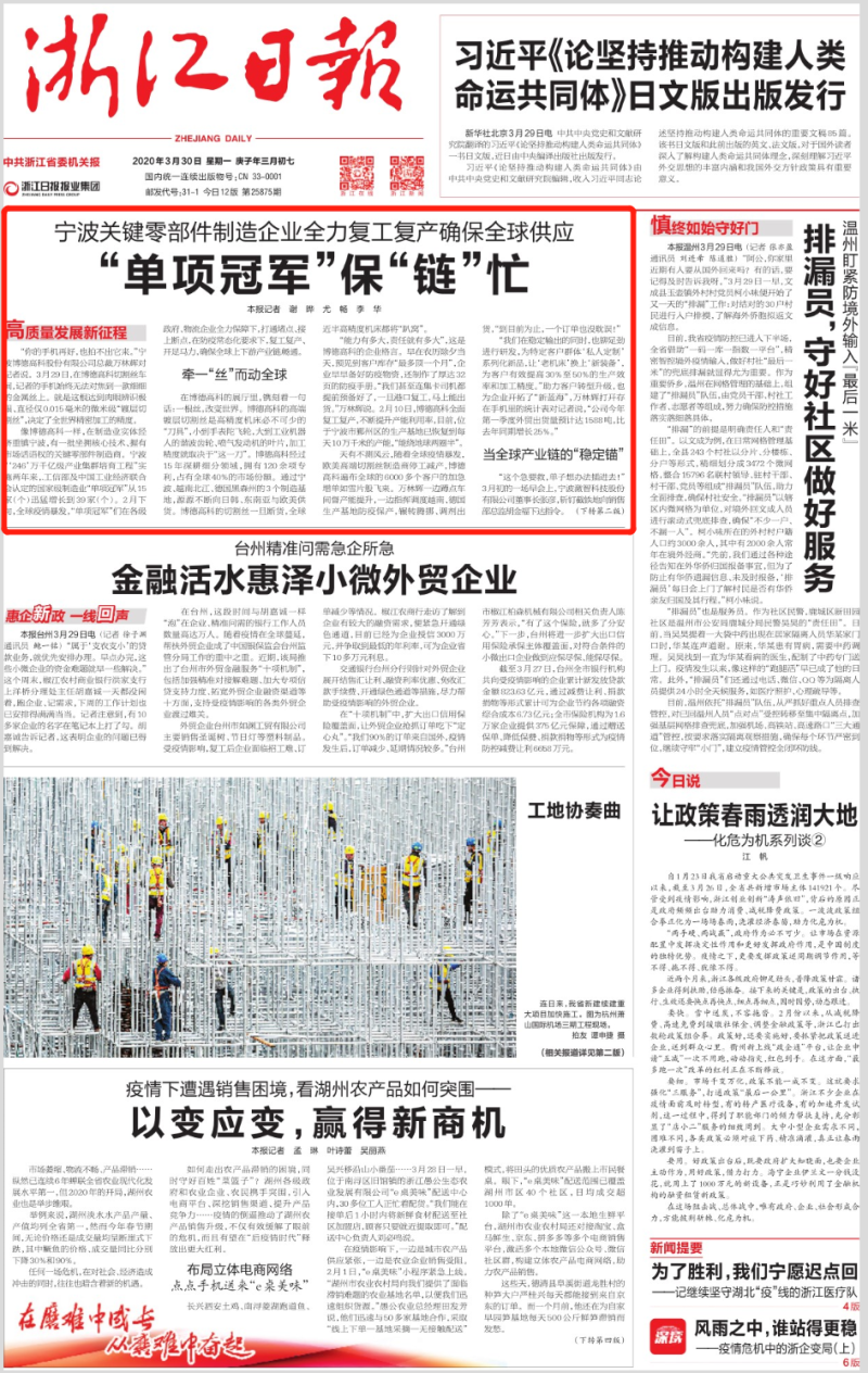 在这个特殊时期,一大批宁波“小巨人”扛起责任,发挥“专精特新”的优势,加班加点、开足马力,确保了全球30多个制造业关键领域产业链的安全稳定。在北仑,向全球车企供应精密铝合金汽车零部件的宁波旭升汽车技术股份有限公司,自复工以来已有50多个集装箱的产品发往海外,特斯拉等多家全球著名汽车厂商还为此发来感谢信;在余姚,江丰电子加班加点生产芯片核心材料——超高纯金属溅射靶材,停工10天的2月,该公司出货量同比增长75.3%,没有一个订单因疫情延误。