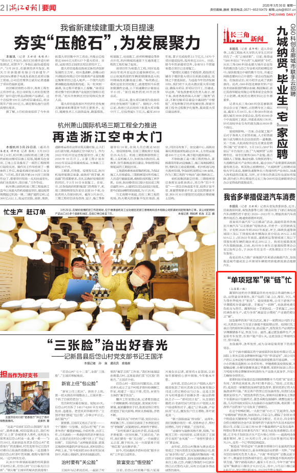 像博德高科一样,在制造业实体经济重镇宁波,有一批坐拥核心技术、握有市场话语权的关键零部件制造商。宁波“‘246’万千亿级产业集群培育工程”实施两年来,工信部及中国工业经济联合会认定的国家级制造业“单项冠军”从15家(个)迅猛增长到39家(个)。2月下旬,全球疫情暴发,“单项冠军”们在各级政府、物流企业全力保障下,打通堵点、接上断点,在防疫常态化要求下,复工复产、开足马力,确保全球上下游产业链畅通。