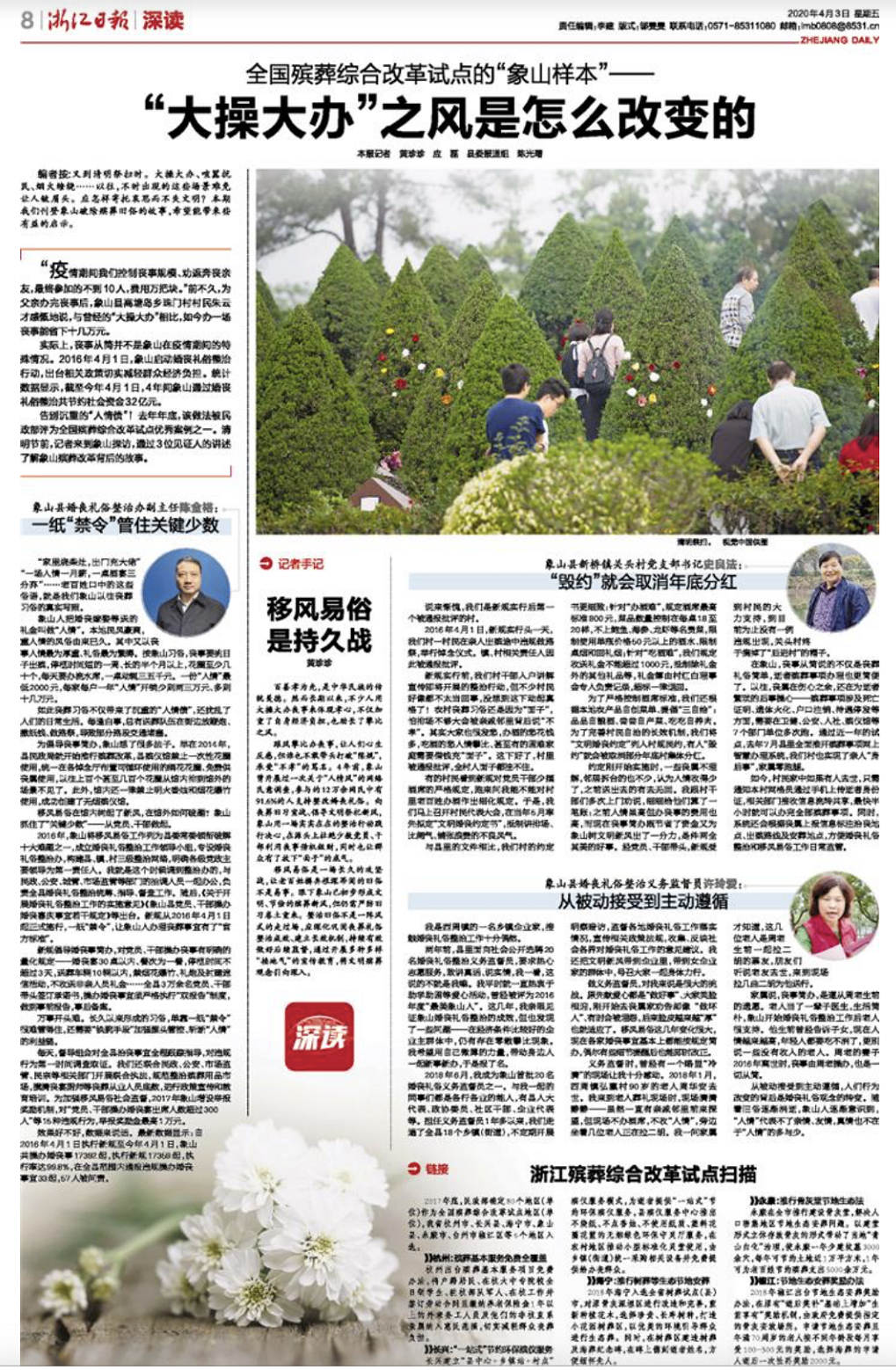 跟风攀比办丧事,让人们心生反感,但谁也不敢带头打破“陈规”,承受“不孝”的骂名。4年前,象山曾开展过一次关于“人情风”的网络民意调查,参与的12万余网民中有91.6%的人支持整改婚丧礼俗。向丧葬旧习宣战、倡导文明祭祀新风,象山用一场实实在在的整治行动践行决心,在源头上杜绝少数党员、干部利用丧事借机敛财,同时也让群众有了放下“面子”的底气。