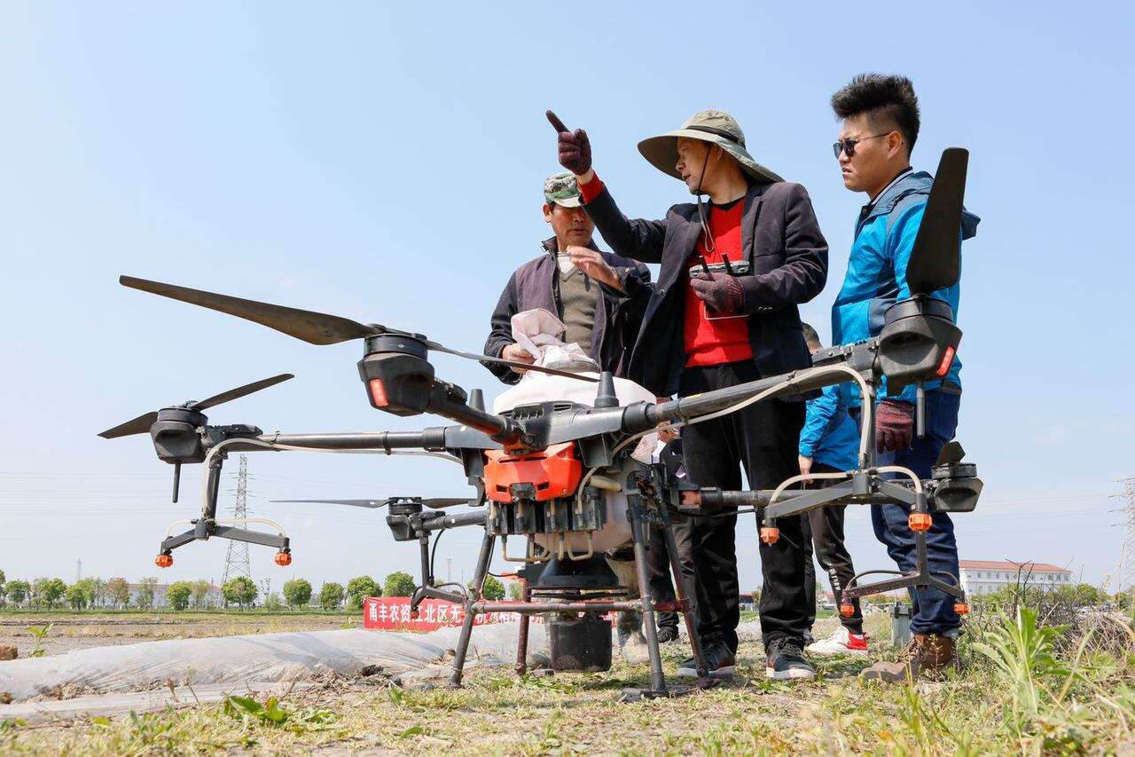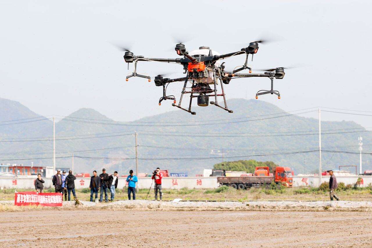 浙江在线-宁波频道4月18日讯(浙江在线记者 应磊 贺元凯 拍友 王涛 摄)春耕正酣,这几天,在宁波江北区庄桥街道邵余村水稻田里,一架植保无人机正在进行水稻直播作业。无人机长约1.5米、重约10公斤。现场工作人员将一包包种子倒入无人机中,随后设置好播种路线及范围,实现自动飞行播种。据了解,该机一天可播种300余亩土地,比传统手工播种效率提高10倍。
