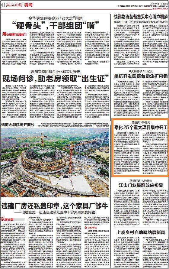 浙江在线-宁波频道5月7日讯(浙江在线记者 周松华 区委报道组 严世君 郑连乔)5月6日,宁波市奉化区举行扩大有效投资重大项目集中开工活动,共有25个项目启动建设,涵盖民生事业、重大产业、重大基础设施等领域,总投资达160亿元。