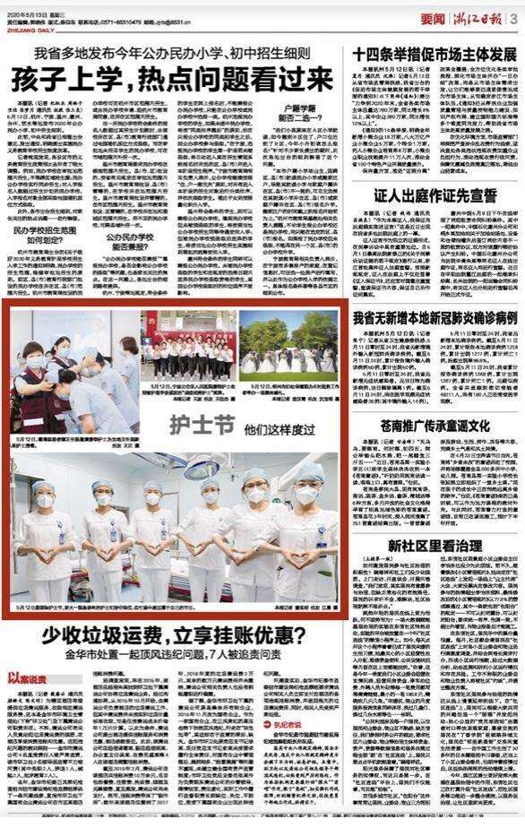 浙江在线-宁波频道5月13日讯(浙江在线记者 王波 通讯员 王佳杰)5月12日是第109个“国际护士节”。新冠肺炎疫情发生以来,“白衣天使”们逆行出征,英勇无畏地投入防控一线,用实际行动践行敬佑生命、救死扶伤、甘于奉献、大爱无疆的职业精神,他们是“新时代最可爱的人”。在宁波北仑区人民医院在门诊大厅集中展示“战疫有我、别样风采”护士节主题作品,用书法、摄影、绘画等形式展示护士坚守前期战疫风采,向护士致以节日问候和崇高敬意!当天,该院援鄂护士收到省护理学会颁发的“战疫优秀护士”奖牌。