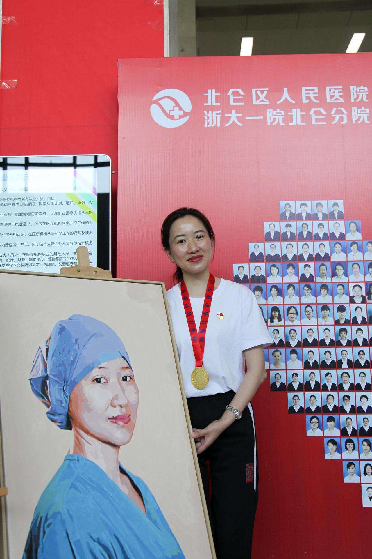 北仑区第三批驰援武汉医疗队队长 区人民医院血液肿瘤科护士长王燕辉在自己的画像前合影留念。