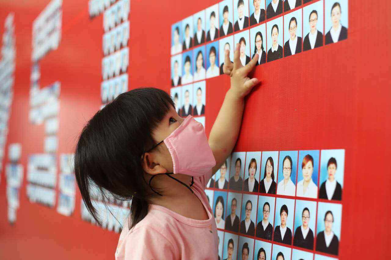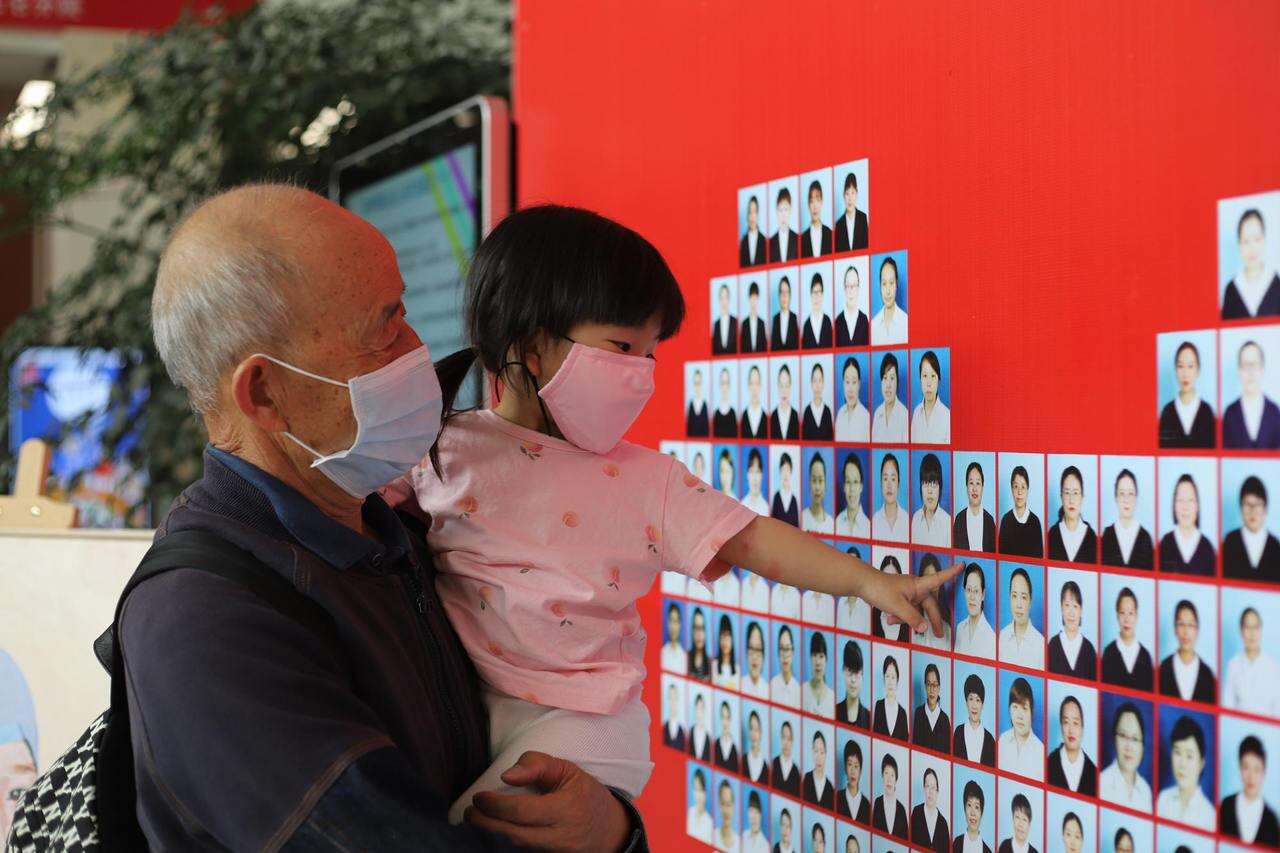一位老人带着孙女在护士照片前寻找熟悉的护士照片!