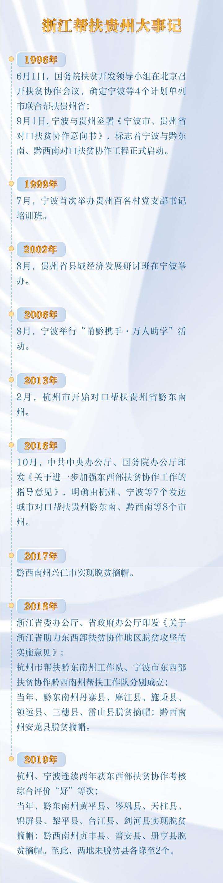 1996年,宁波市与贵州省黔东南苗族侗族自治州、黔西南布依族苗族自治州对口扶贫协作工程正式启动。自此,两个州数百万贫困人口的命运,便与浙江紧紧相连。宁波至今共派出24批139名干部投身这场艰苦卓绝的脱贫攻坚战;2013年,杭州接力帮扶黔东南州,宁波继续帮扶黔西南州。杭州至今共派出5批52名干部。