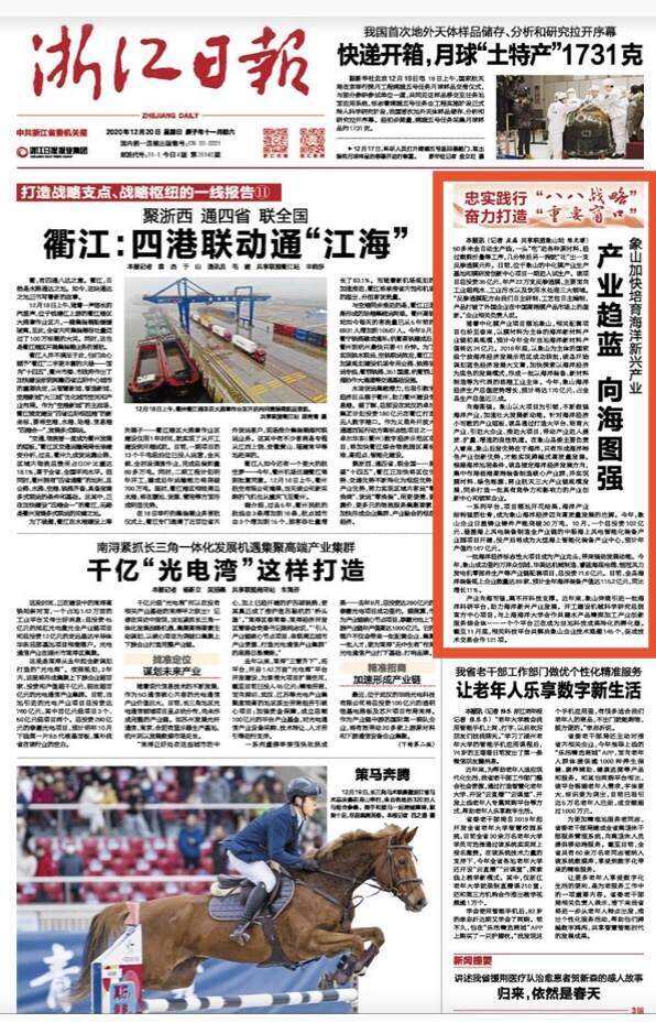 随着中化膜产业项目落地象山,相关配套项目也纷至沓来,以膜材料为主体的海洋新材料产业链初具规模,预计今年全年当地海洋新材料产值将达24亿元。2018年底,以象山为主体的国家级宁波海洋经济发展示范区成功获批,该县开始谋划蓝色经济发展大文章,加快探索以海洋经济为底色的发展模式,形成一批以海洋装备、新材料制造等为代表的临港工业主体。今年,象山海洋经济生产总值逆势增长,预计将达170亿元,占全县生产总值近三成。