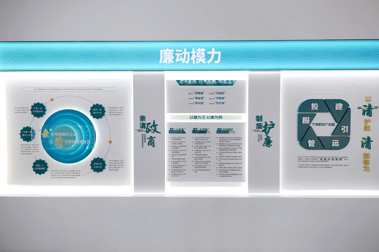 廉洁文化展厅行至宁波模具产业园廉洁文化展厅,该展厅分清风塑心、廉动模力、清正服务、廉行园区四个区域,围绕不同主题,多角度展现宁波模具产业园廉洁文化体系内核。