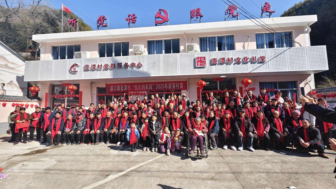 村民合影 通讯员供图“提前祝大家新春快乐!吃饱吃好,谁都别客气!”1月18日,在宁波奉化区溪口镇的壶潭村,一场别开生面的新春村宴正在热热闹闹地举行。近200位村民受邀参加村宴提前过春节。