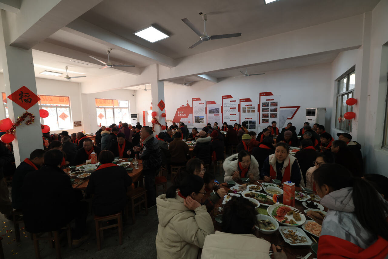 当天上午,志愿者和村民一起在壶潭村党群服务中心·文化礼堂挂上了“壶潭村我们的家园2025春节村宴”的横幅。门、窗都贴上了红色福字以及对联,现场随处可见喜庆的元素。