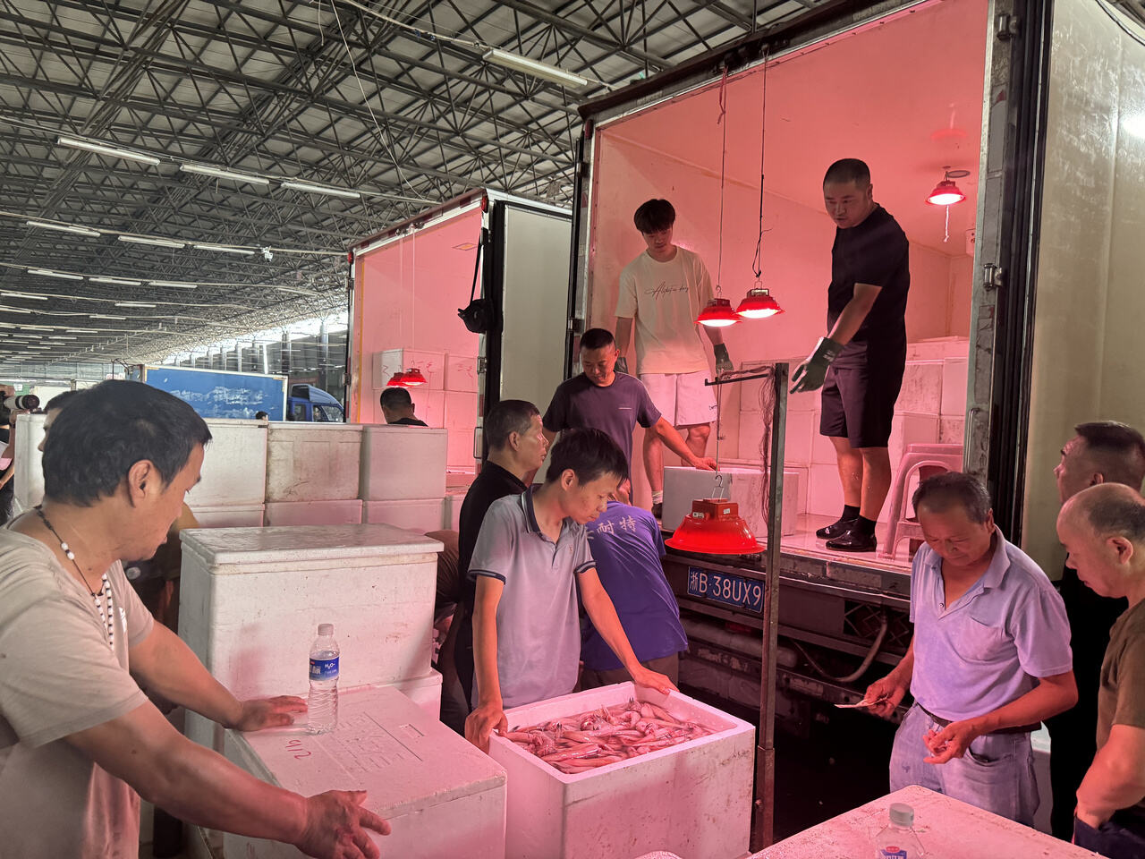 “第一网”海鲜到了批发市场 采购商第一时间上前订货 通讯员 供图在专营虾潺的摊位上,经营户马俊处理着手头一箱箱新鲜泛着光泽的虾潺。“‘第一网’还是挺多的,产量比起去年还增加了一些!今天到货的一车有150箱,现在已经卖掉一大半了。”