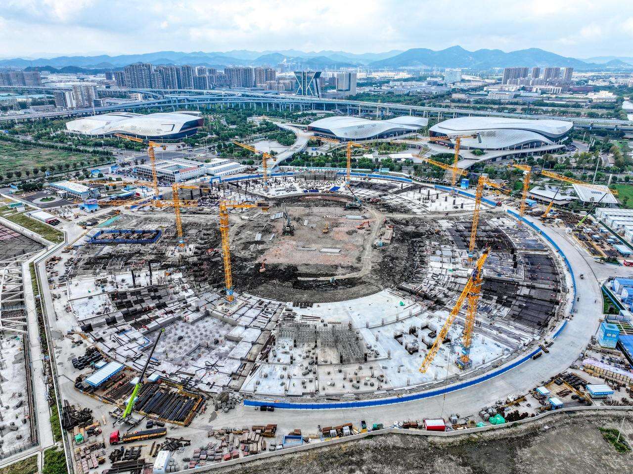 10月16日,位于姚江畔的宁波奥体中心二期主体育场项目建设现场一片忙碌场景,工程地基基础施工已完成50%,地下室底板施工进度也已过半,整体工程建设正按既定目标高效有序推进。