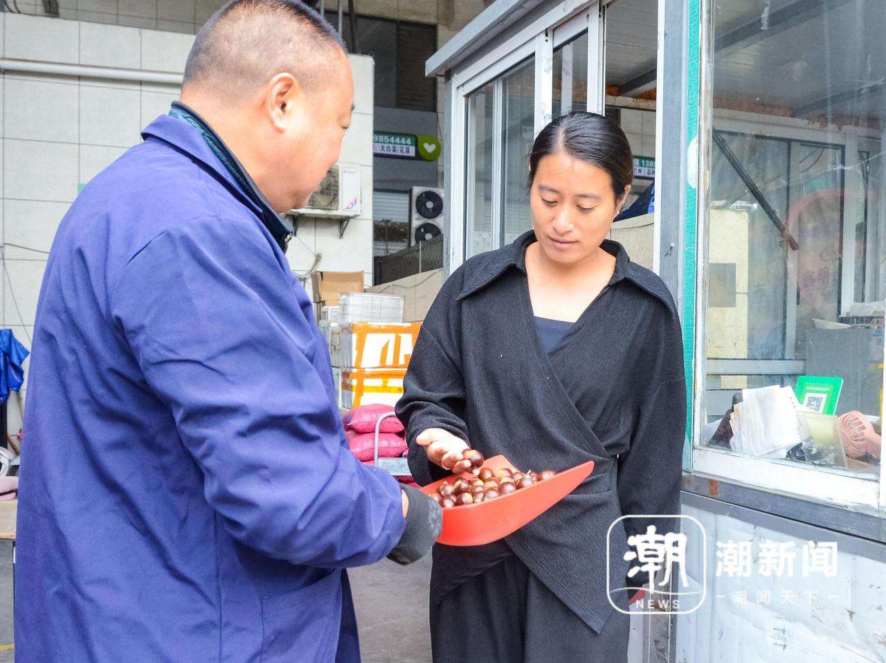 板栗经营户正在接待批发商 记者 段琼蕾 摄市民黄雪阿姨和姐妹们组队来批发板栗,“每年这时候,家里餐桌上少不了板栗烧鸡、板栗红烧肉!”她还现场学了一招挑板栗秘诀:外壳要深褐光滑,拿在手里掂一掂,越沉越饱满。