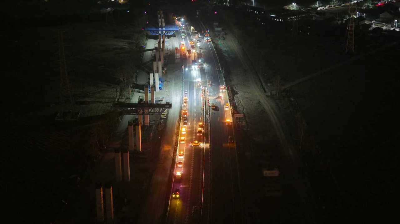 “我们采用‘双向断流+车道封闭”组合模式,尽可能降低对交通的影响,还启用了’无人机+高杆灯’组合照明,来保障夜间施工安全。”项目公司有关负责人说。