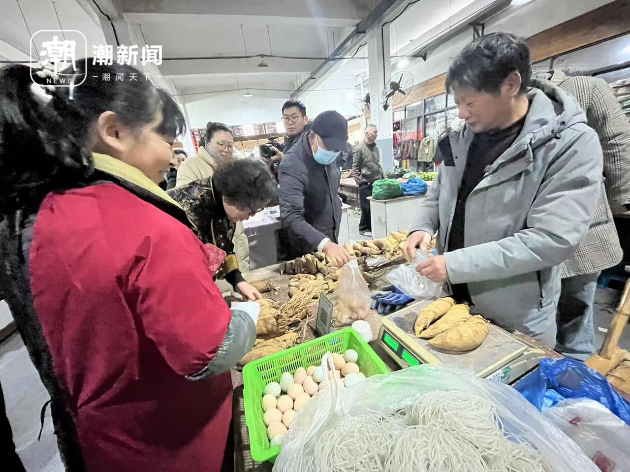 姚国章(右)正在摊位前售卖冬笋和鸡蛋。记者 王波 摄