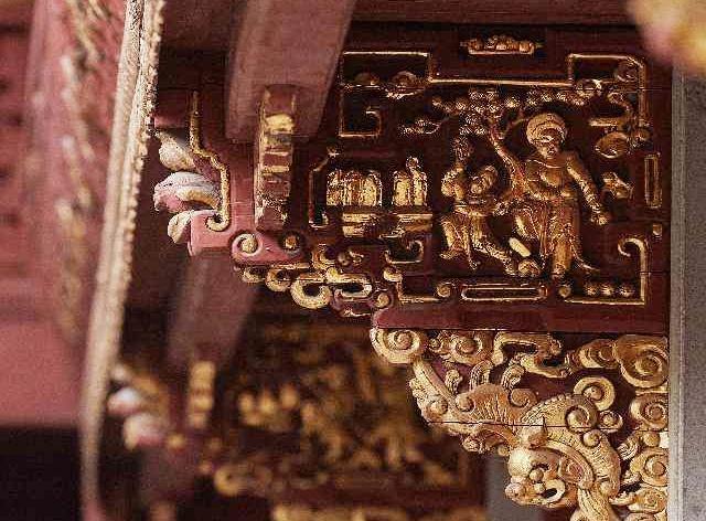 庆安会馆里藏着1000多件朱金漆木雕。“一贴金,满堂流光。”浙江省工艺美术大师、朱金漆木雕修复团队负责人谢武宏感叹。这些朱金漆木雕高悬于10多米高的梁上。近距离观察后,谢武宏兴奋地发现,正殿轩梁的上下两层梁架和后殿的朱金漆木雕,风格不尽相同。庆安会馆修缮团队据此推测,当年建造庆安会馆的工匠可能来自两三个团队,几个团队同步赶工,体现出各自的巧思。