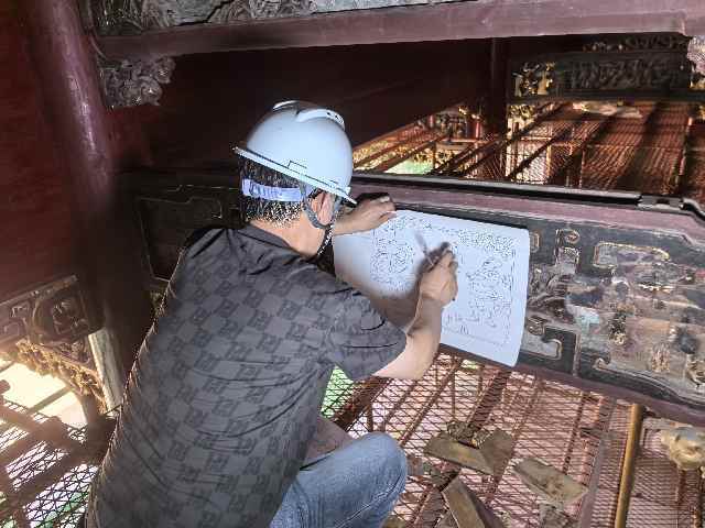 朱金漆木雕花板图样比对。去年5月,宁波大学潘天寿建筑与艺术设计学院建筑系师生,从庆安会馆侧门鱼贯而入,此时,修缮工程正如火如荼。大殿一角,拥有53年漆作经验的金士斌,正蹲在地上,一丝不苟地调配着漆料。